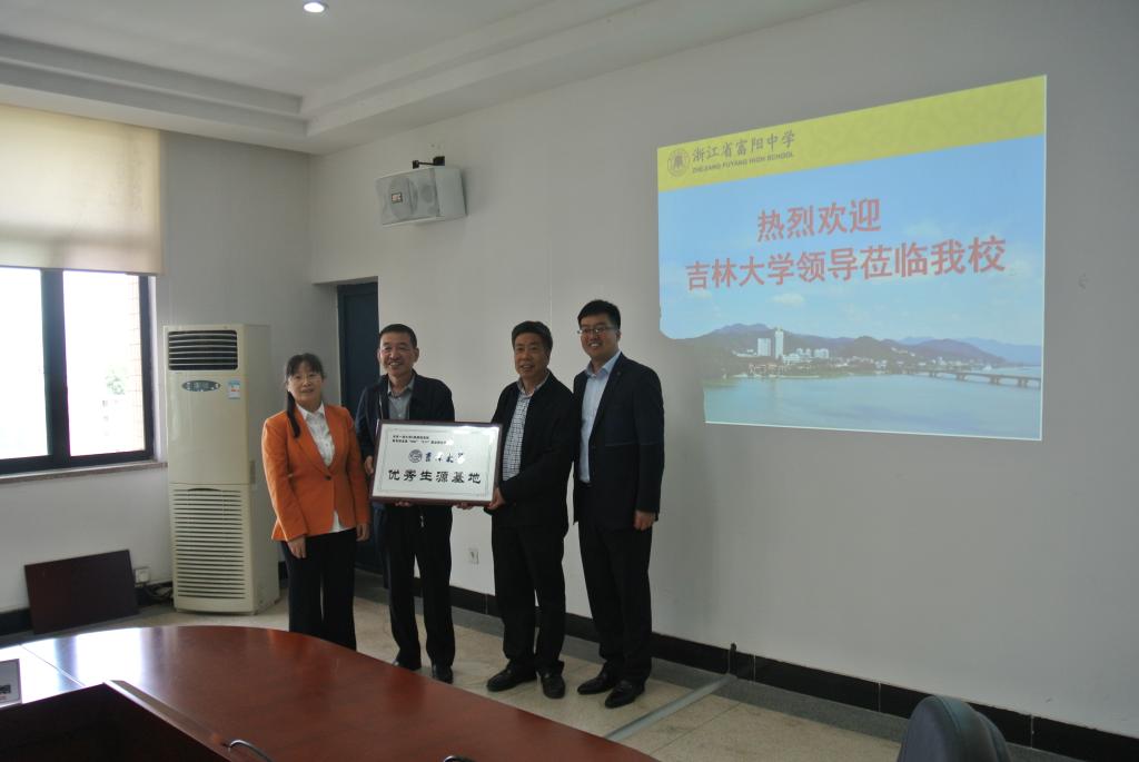 在富阳中学,校长丁明中,副校长赵承军,党委副书记周朝勇,副校长季丰与吉林大学招生宣传组的老师进行了座谈,丁明中校长介绍了富阳中学的情况和浙江省高考改革的模式,并对吉林大学招生宣传提出了建议;嵇艳鞠院长通过PPT介绍了吉林大学的情况,重点介绍了学校大类培养与交流、校内转专业、人才成长等工作,并播放了吉林大学2019年招生宣传片,并表示将根据丁明中校长的建议做好今后吉林大学的招生宣传工作,最后嵇艳鞠院长向丁明中校长授予了“吉林大学优秀生源基地”牌匾。