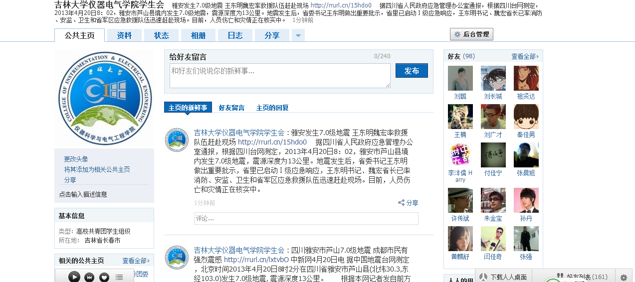 团委运用微博、人人网等新媒体工具第一时间向学院青年师生发布灾区信息,各班级团支部利用微博等关注灾情,广大青年学生在网络上第一时间向四川雅安地震灾区传递祝福。